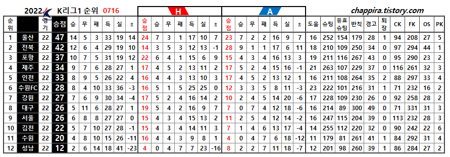 ● K리그1 순위, 2022 K리그1 순위, K리그1 기록, K리그1 홈 원정 기록,케이리그1